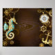 Fondo de madera marrón con mar, cresta mecánica, volante antiguo, ancla dorada y varios engranajes de oro y latón. Estilo Steampunk.