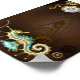 Fondo de madera marrón con mar, cresta mecánica, volante antiguo, ancla dorada y varios engranajes de oro y latón. Estilo Steampunk.