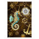 Fondo de madera marrón con mar, cresta mecánica, volante antiguo, ancla dorada y varios engranajes de oro y latón. Estilo Steampunk.