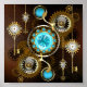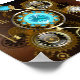 Lentes turquesa con un reloj de antigüedades con engranajes de latón y llaves doradas sobre un fondo oxidado y marrón. Estilo Steampunk.
