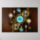 Lentes turquesa con un reloj de antigüedades con engranajes de latón y llaves doradas sobre un fondo oxidado y marrón. Estilo Steampunk.