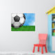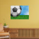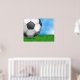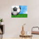 Primer plano del ilustracion de una pelota de fútbol sobre un campo de hierba. La pelota está diseñada bajo el suelo. También hay espacio en el cielo para añadir un mensaje de texto si lo desea. Imagen disponible en varios regalos y productos.