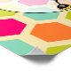 Una abeja feliz con su cuchara de miel en un círculo transparente con un borde negro. Una colmena hexagonal fría en forma de fondo en colores vintage de rosa, azul, naranja y verde.