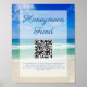 Una hermosa foto de olas del océano decora este cartel moderno de fondo para luna de miel de boda de destino. Un precioso guión cursivo azul sobre la fotografía tropical de la costa para el letrero de su boda en la playa.