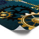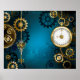 fondo turquesa, texturado, de vapor punk con bronce y oro, llave de plata y reloj. Estilo Steampunk.