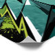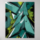 Un graffiti dinámico con formas geométricas nítidas, superficies tridimensionales como el cristal y contrastes audaces de verde, turquesa, negro y blanco. El fondo está lleno de salpicaduras y salpicaduras de pintura vibrante, lo que crea una sensación de energía, movimiento y caos al estilo de las calles. Este diseño abstracto de arte callejero combina la estética del graffiti urbano con la abstracción geométrica moderna.