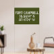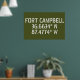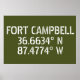 Coordenadas de mapas de latitud y longitud para Fort Campbell, localizadas entre Clarksville TN y Hopkinsville KY Stencil estilo tipo fuente blanca sobre fondo verde del ejército.