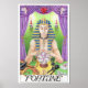 For the (wheel of) Fortune card I thought a fortune teller decked out in Mardi Gras colors made the most sense. She wears a sphinx headdress and is gazing into her crystal ball. I took the symbolism found on the Rider Waite deck and tweaked and twisted it but you can see anubis on the right and the dragon on the left.