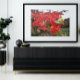 Impresión poster de estilo brillante con una colorida imagen fotográfica de hojas de arce rojas brillantes y un santuario rojo en miniatura en un jardín japonés. Personalizar el tamaño de impresión de su poster según lo desee. Foto: Parque Point Defiance en el Jardín Japonés.