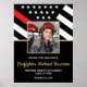 Este diseño presenta una bandera de bomberos con franjas negras y blancas, y una franja de línea roja delgada también. Una insignia de bombero se encuentra encima de todos los detalles de la fiesta para el bombero graduado, que está al lado de una imagen del nuevo graduado de la academia de bomberos.