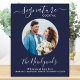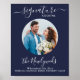 ¡Bebidas con nombre personalizado! Caligrafía simple y elegante, este letrero de barra de bebidas con nombre personalizado presenta un cóctel 'los recién casados', personalizado con su bebida favorita. Personalice este elegante letrero de boda con su foto de compromiso o foto de pareja favorita, nombre y bebida con nombre personalizado. También puede personalizar las fotos de las bebidas con nombre personalizado con sus mascotas favoritas para una boda de mascotas. Personalice con fotos de perros o gatos. DERECHOS DE AUTOR © 2020 Judy Burrows, Black Dog Art - Todos los derechos reservados. Póster de barra de boda de foto de cóctel con nombre personalizado azul marino.