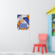 Añada una foto de equipo a este poster conmemorativo de voleibol de los chicas con un voleibol azul, naranja y blanco que se amplía de forma abstracta como fondo sobre el cual se puede personalizar el nombre de su escuela, la mascota del equipo, el año escolar, el número de la camiseta y el nombre - un patrón caleidoscópico floral se mezcla con los paneles de voleibol azul y naranja y un patrón de swift artístico abstracto una vibración de niñez - de katz_d_zynes