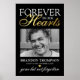 Elegante cartel memorial fúnebre con una imagen de su ser querido fallecido, el texto "por siempre en nuestros corazones", su nombre, fechas de nacimiento y defunción, un corazón de lámina de oro falso y la frase conmemorativa "ausente pero no olvidado".