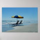 Los magníficos posters de la playa, situados a lo largo de la playa de Daytona, Florida, cuentan con una fotografía de dos tumbonas y un paraguas amarillo y azul. Un hermoso cielo azul y agua azul con olas estrelladas aparece en esta fotografía de las vacaciones.
