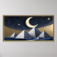 Pirámides estilizadas con precisión geométrica colocadas bajo una luna creciente y constelaciones de estrellas simplificadas, utilizando tonos dorados y marinos mutados para un aspecto sofisticado.