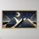 Pirámides estilizadas, geométricas, luna creciente, constelaciones estelares, oro mudo, tonos de marina.