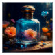 El 21 de marzo es el Día de la Fragrancia. Vida de una botella de perfume con melocotón y flores azules.