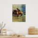 Frederic Remington era un pintor, ilustrador, escultor y escritor norteamericano más conocido por su arte que representaba a los vaqueros, soldados y nativos americanos del viejo Occidente. Nacida en Canton, Nueva York, Remington encontró inspiración en estos temas desde temprana edad. Le encantó la idea de la frontera y viajó muchas veces al oeste. Admiró grandemente a los duros y heroicos vaqueros y soldados que encontró allí, escuchando sus historias y siguiendo sus vidas en sus visitas como periodista/ilustrador. En estos viajes, Remington tomó una cámara e hizo sus propias fotografías, no como arte, sino como notas. Llevaba cuadernos y esbozaba todo, desde horizontes lejanos hasta detalles de pliegues con botas de cuero. Trabajó para las grandes revistas de los años 1880 y 1890, y produjo más de 3.000 cuadros y dibujos firmados. La mayoría de ellos eran ilustraciones, pero muchos fueron hechos como arte cuando se alejó del mundo editorial y logró un arte magistral. Esta imagen se llama "La estampida" y representa a un vaquero galopante tratando de convertir una manada estampida de ganado longanorruño en medio de una tormenta relámpago y una lluvia torrencial.