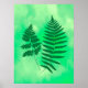 Impresión de una silueta de dos frentes de helecho, en verde esmeralda, contra un fondo de acuarela verde suave de menta