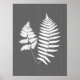 Impresión de una silueta de dos frentes de helecho, en blanco, contra un fondo texturado de seda falsa de color gris/gris carbón