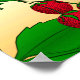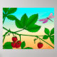 Impresión de "Fresas en una rama" con borde - diseño gráfico de medios mixtos, dibujo vectorial mejorado digitalmente de plantas de fresa y una libélula contra fondo de puesta del sol