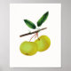 Dos manzanas Soulard brillantes colgadas de una rama arbórea con dos hojas verdes de color medio.