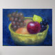 ¡¡Fresco!! Dos manzanas, un naranja, un limón y dos racimos de uva se reúnen en este tazón de latón. Esta pandilla de fruta fresca y encantadora alegrará cualquier cocina. Esta es una copia de una pintura al óleo original del artista Krishna Sadhu. Puedes contactar con el artista en aamikrishna@gmail.com si quieres una pintura original hecha por ti.