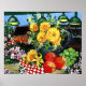 Una colorida pintura de frutas y flores sobre una mesa de un día en el mercado Pike Place de Seattle.