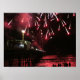 Los fuegos artificiales rojos sobre el agua en el muelle de Hermosa Beach, CA.