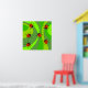 Funky cartoon red ladybugs scuttling around against a retro green swirly background design.