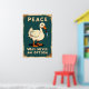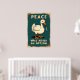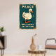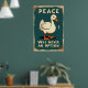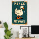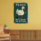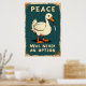A cartoon white goose stands holding a knife in its beak, with the text "PEACE WAS NEVER AN OPTION" above and below it, set against a teal and beige background. Clear details and vibrant colors