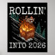 Póster Funny Raccoon Rolling Into 2026 Retro New Year 202