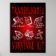 La imagen es un ilustracion estilizado de un kit de asesinato de vampiros. Las palabras "Transilvania" y "Survival KIT" están escritas en letras grandes, rojas, de estilo gótico en la parte superior e inferior, respectivamente. En el medio, hay seis dibujos delineados en blanco de objetos que tradicionalmente se usan para matar vampiros: una estaca y un mallet, una biblia, una pistola con balas de plata, una botella de agua bendita, ajo y una cruz. Un regalo perfecto para los amantes de los Góticos y los vampiros.