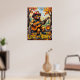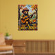 Esta encantadora obra de arte cuenta con un oso vestido de bombero, con casco y gafas de sol, que toca una guitarra acústica mientras se sienta en una rústica valla de madera. El fondo muestra hojas de otoño coloridas sobre los árboles y diseminadas por el suelo, creando un ambiente de caída vibrante. Un frasco de miel se sienta en un poste a su lado. El cuadro utiliza pinceladas gruesas y texturadas, que le dan un aire caprichoso y reconfortante, con "Amar a mi miel" escrito a continuación.