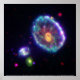 Hace aproximadamente 100 millones de años, una galaxia más pequeña (tal vez una de las que están a la izquierda del Cárter) se desplomó a través del corazón de la galaxia CartWheel, creando ondas de formación de estrellas breves.