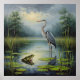 Una pintoresca representación de una garza sobre colchonetas de lirios en un apacible estanque rodeado de vegetación exuberante, mostrando la belleza de la naturaleza y la vida silvestre en un ambiente tranquilo y tranquilo.