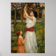 The scene balances tenderness and freshness, with pink petals, textured foliage, and a brick wall that adds depth and warmth behind the figures. Waterhouse’s careful detail and luminous color give the painting a peaceful, storybook calm, celebrating simple rituals of nature and the intimacy of shared attention.