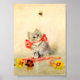 Poster con la obra de arte Kitten de Meta Plückebaum con cinta roja (b. 1876). Un gatito gris con rayas oscuras está bellamente adornado con una cinta roja. El gatito juega con una abeja. Las flores amarillas decoran el primer plano. ¡Un regalo maravilloso para los amantes del gato y del arte alemán!