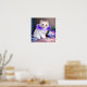 ¡poster con un gatito blanco magnífico! Un gatito mullido lleva un collar de flores moradas. Un tazón azul de flores blancas y moradas se sienta a la derecha. Un regalo maravilloso para los amantes del gato y del arte victoriano.