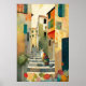 Este diseño animado representa un gato colorido encaramado a un lado de una escalera empinada en un pintoresco pueblo mediterráneo. El estilo capta la esencia lúdica del gato, mientras que el uso de colores audaces y vibrantes da vida a la escena callejera. Los tonos cálidos de naranja oscuro y esmeralda clara evocan los colores de las casas mediterráneas, añadiendo encanto a la pieza. En general, este trabajo es un hermoso ejemplo del poder del color y la caprichosidad en la creación de escenas cautivadoras en la calle.