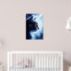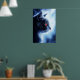 La imagen muestra un retrato de cerca de un gato negro con ojos rojos penetrantes. La piel del gato se representa en un estilo suave, casi etéreo, con un ligero matiz azul. El fondo es un diseño abstracto y borroso de azul y blanco que crea una sensación de misterio e intriga. La mirada del gato está dirigida hacia la derecha, sus bigotes prominentes y su expresión alerta y vigilancia. Un regalo perfecto para los amantes del gato.