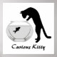 Silhouette de un curioso gato mirando a un tazón de pescado mientras el pez mira hacia atrás.