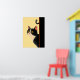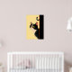 Un gato esmoquin asomando a la vuelta de la esquina con una expresión curiosa, mientras un pequeño gusano rayado aparece juguetamente encima. El diseño minimalista y el fondo amarillo cálido realzan la naturaleza caprichosa y alegre de la escena.