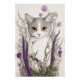 Un ilustracion digital de un dibujo de una línea de un gato con flores moradas.
