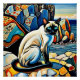 A.I. creó la impresión de un estilizado gato siamés con llamativos ojos azules se sienta entre rocas vibrantemente coloreadas cerca del mar.