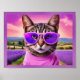 Poster con un fantástico arte de fantasía. Un gatito jazzy con un moderno cuello de tortuga y gafas de sol moradas se alza contra un telón de fondo de campo de lavanda. Perfecto para todo aquel que ame los gatos modernos, el humor y las vibraciones tempranas del verano, con arte de fantasía.