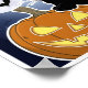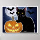 El diseño incluye un gato negro sentado al lado de una calabaza tallada con una cara sonriente. El fondo incluye un cielo nocturno con luna llena y varios murciélagos voladores. La imagen representa probablemente los temas de Halloween, dada la presencia del gato negro, que a menudo se asocia con la superstición y la festividad, y la linterna jack-o’, que es una decoración común de Halloween. La luna llena se suma al ambiente espeluznante que se suele disfrutar durante las celebraciones de Halloween.