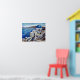 pintura de un gato negro encaramado en una iglesia encalada en la hermosa Santorini, Grecia.