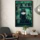 Un majestuoso gato negro con un impresionante pecho blanco se sienta orgullosamente en una estantería negra rodeada de vibrantes macetas verdes. El fondo verde profundo resalta el follaje exuberante y los ojos dorados penetrantes del gato, creando una composición armoniosa y dramática. Perfecto para los amantes del gato y de las plantas, esta imagen capta la serena coexistencia de la naturaleza y el encanto felino.