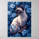 Un gato siamés con impresionantes ojos azules se sienta en medio de un exuberante jardín de flores azules. El pelo blanco del gato contrasta maravillosamente con los tonos azules de las flores, creando una escena visualmente cautivadora. La mirada del gato se dirige hacia la derecha, añadiendo un sentido de misterio e intriga a la imagen. El fondo es un poco azul y verde, lo que sugiere una atmósfera serena y tranquila.